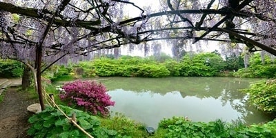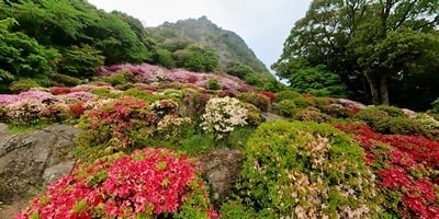 佐賀県 県内の地域区分は歴史的経緯から、唐津市を中心とした北部(北西部)と佐賀市を中心とした南部(南東部)に分かれる。唐津・伊万里・有田などの古くからの陶磁器の産地として有名。唐津市・東松浦郡は、虹の松原、屋形石の七ツ釜の海食洞など、玄界灘・唐津湾に面した海沿いの自然景勝地として知られ、県庁所在地の佐賀市は平坦な田園地帯の中にあり、城下町時代の名残のある込み入った街路や水路網などの景観が特徴的である。県南部一帯には泥質干潟の有明海が広がり、玄界灘や伊万里湾とは大きく異なった景観となる。 御船山楽園すり鉢状のつつじ谷(久留米つつじ) 御船山楽園萩野尾御茶屋脇の推定樹齢170年の大藤